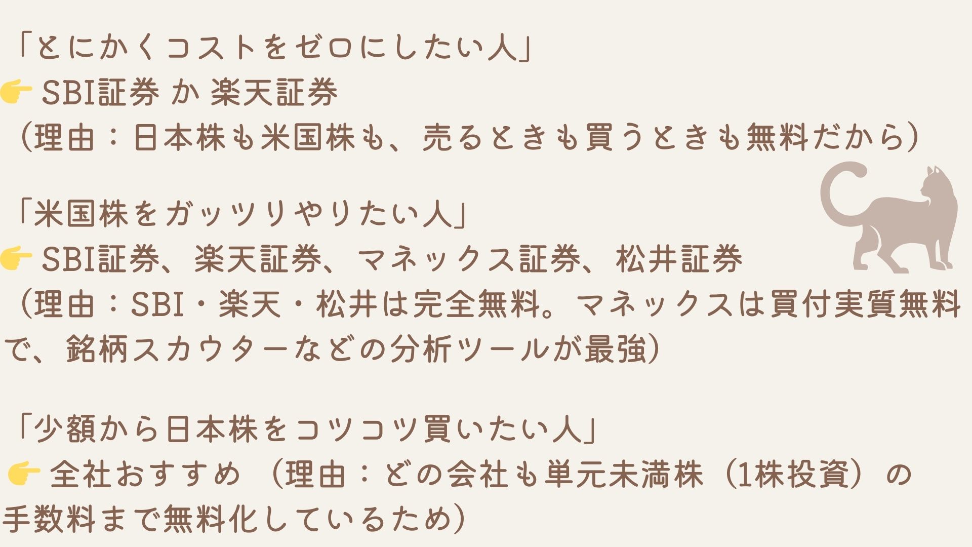 「無駄なコストは1円でも払いたくない」「米国株や高配当株を少しずつ買い増していきたい」という方にとって、マネックス証券は非常に理にかなった選択肢と言えるでしょう。