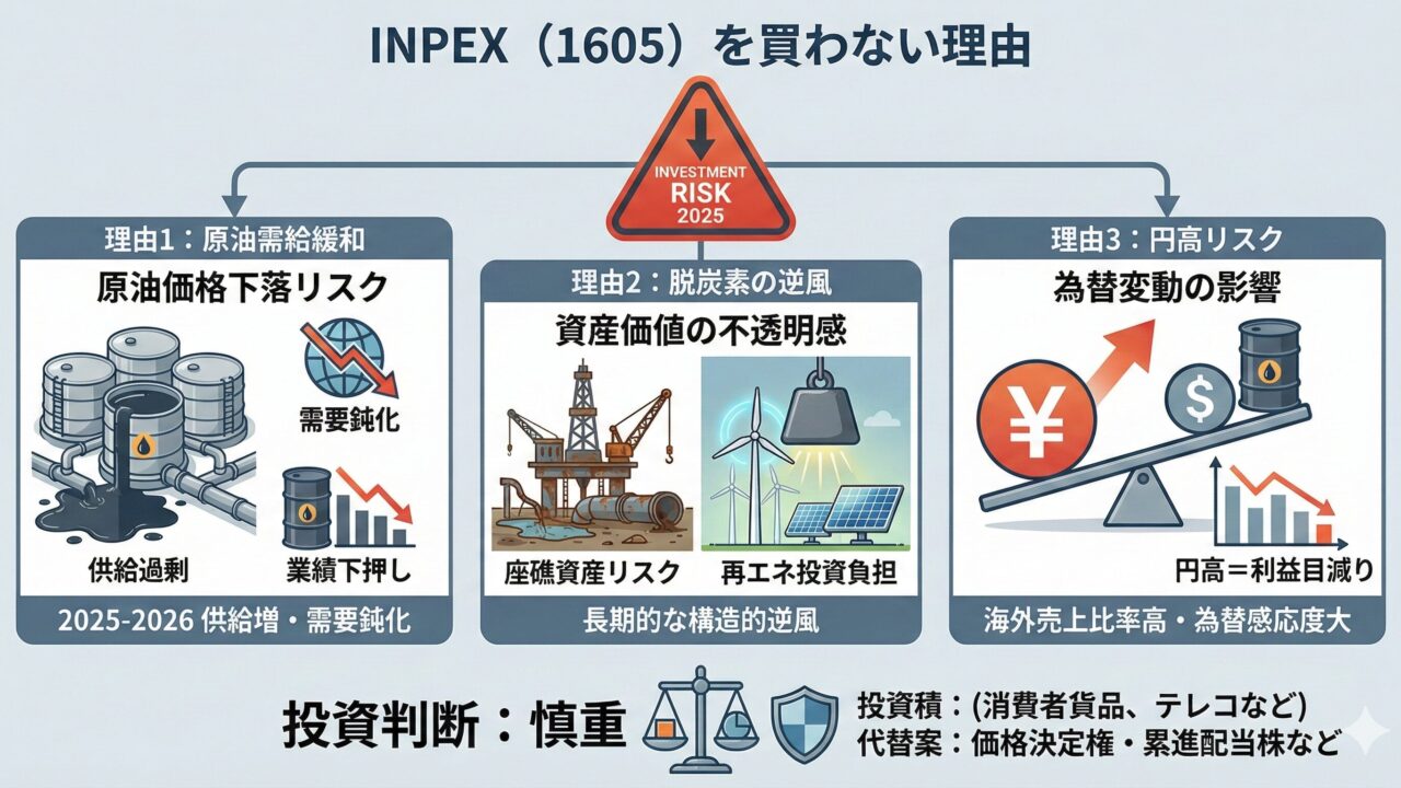 投資は「良いこと」ばかり見ていては足元をすくわれます。 もし私が今、キャッシュポジションに戻って「今からINPEXを買うか?」と聞かれたら、正直悩みます。その理由は、以下の3つの「逆風」が吹く可能性があるからです。