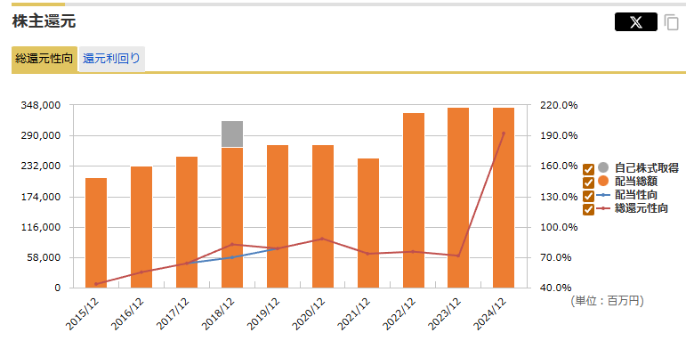しかし、最近の財務データを見て「おや?」と思った鋭い方もいらっしゃるのではないでしょうか。 なんと、JTの総還元性向(配当+自社株買い)が200%弱に達することがあるのです。