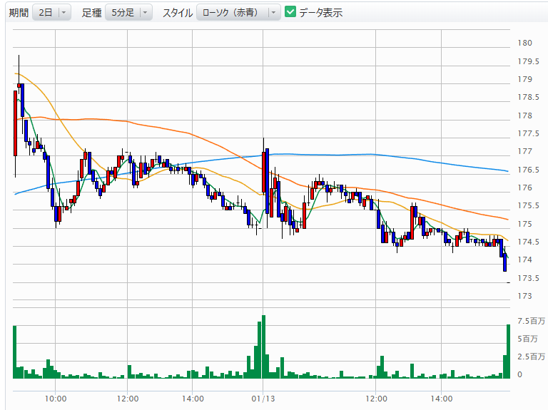 寄り付き天井とジリ安の展開: 朝一番に177.5円台の高値をつけましたが、そこから一度もその高値を更新することなく、右肩下がりの展開となりました。