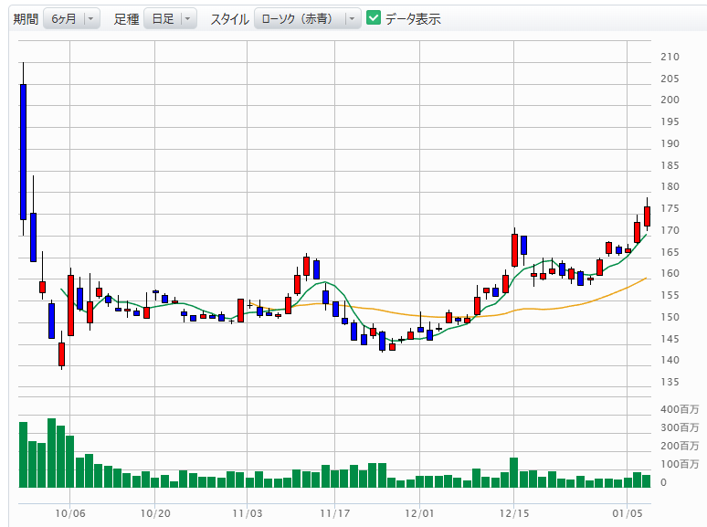 「逃がした魚」の正体: 1月5日の終値(167.1円)で買えていれば、わずか2日間で約5.7%の利益でした。この数字だけ見れば惜しいですが、新NISAでの長期保有を前提とするなら、この「垂直上昇」の途中で飛び乗るリスクは、リターンに見合わないほど高まっています。