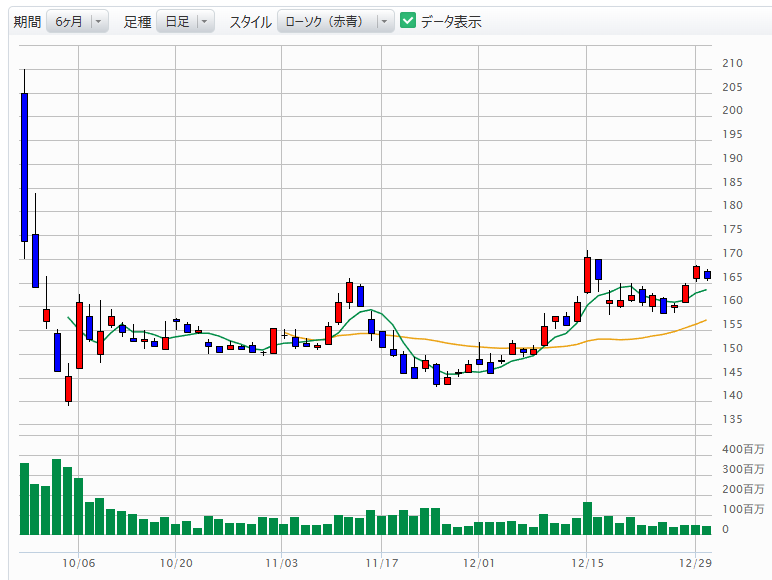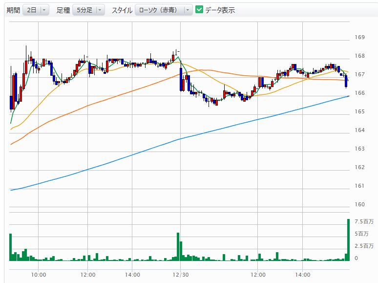 じわじわと削られる株価: 朝方は期待感からか167円台で粘っていましたが、午後から力なく右肩下がりに。