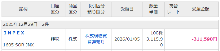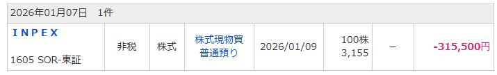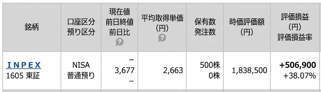 記念すべき第1弾は、私のポートフォリオの主軸、INPEX(1605)