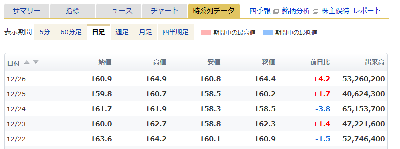 週半ばに「160円割れ」の恐怖を味わったかと思えば、週末には「完全復活」。 そんな激動の1週間(12/22~12/26)と、来週への期待が高まる金曜夜間(PTS)の動きを振り返っていきます!