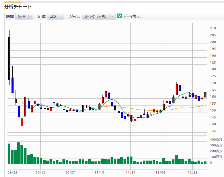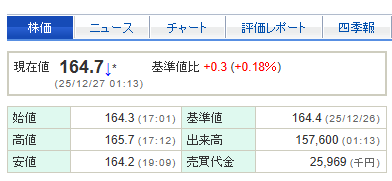 なんと、日中の高値(164.9円)を超えて、一時165.7円まで買われています。 週末のリスクを恐れず、「月曜日はもっと上がる」と信じている投資家が多い証拠ですね。