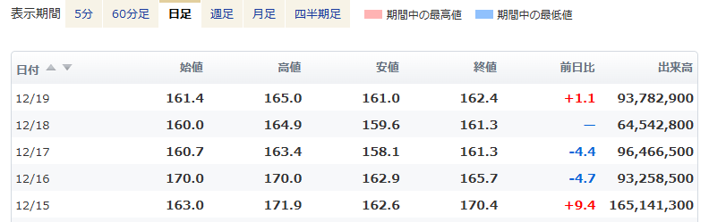 通常市場の終値(162.4円)から、さらに1.6円上げています。 これ、実は金曜日の日中高値(165.0円)に肉薄する水準なんです。