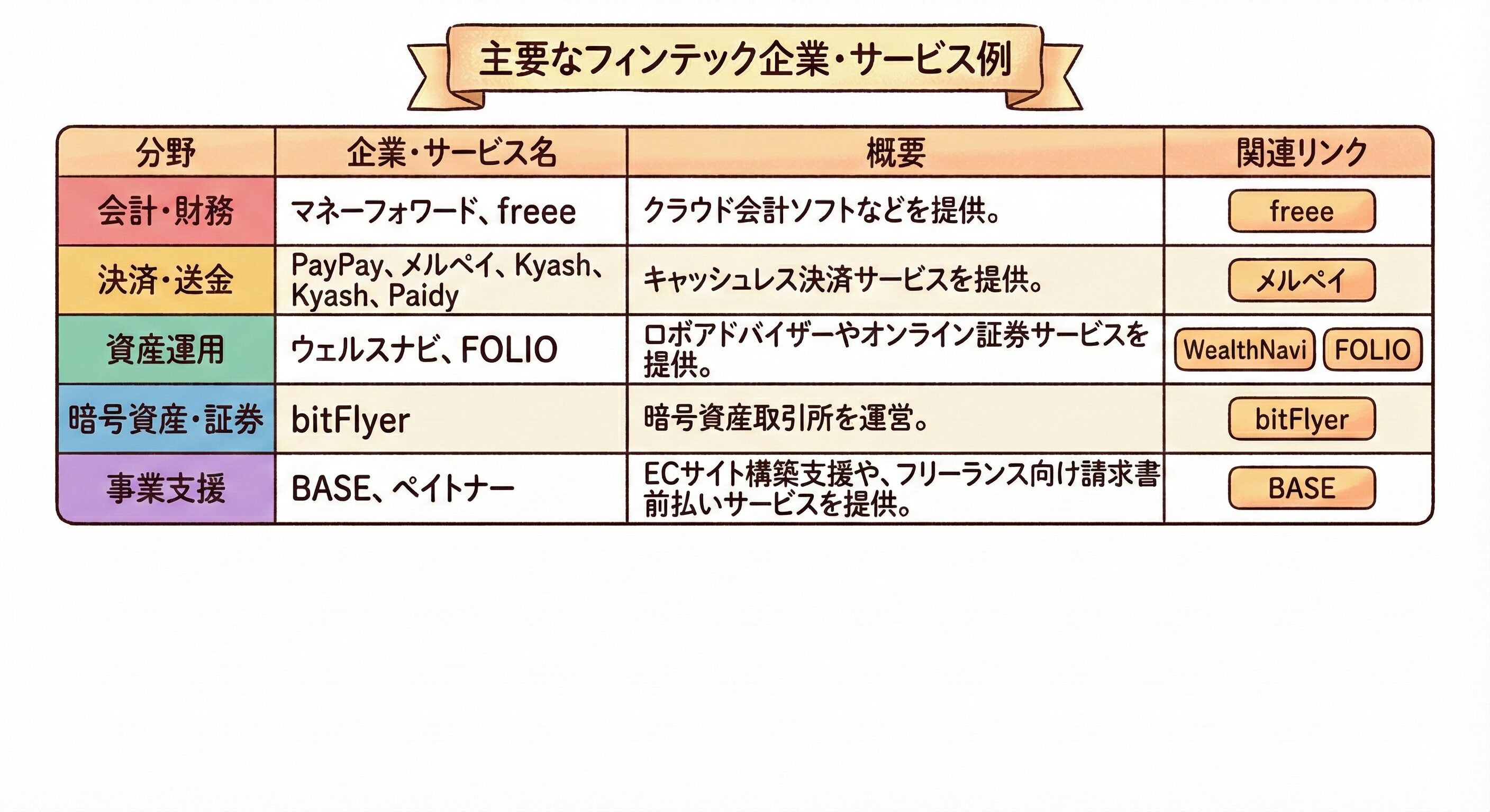 主な日本のフィンテック企業や関連サービスには、以下のような例があります。