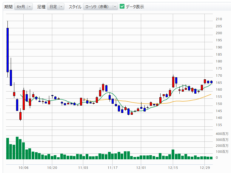 株価が上昇しようとするたび、170円の手前でピタリと止められているのが分かります。ここには、過去に高値で買ってしまった人たちの「やれやれ売り」の注文が厚い壁のように存在しているのでしょう。