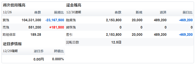 また、信用取引の状況を見ると、信用倍率が約189倍と非常に高く、将来の売り圧力となる「買い残」が積み上がっているのも気がかりです。