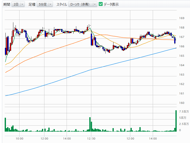 12月30日のチャートを見ると、日中は高値圏にいたものの、引けにかけてズルズルと売られ、結局166円台後半まで下げて終わりました。これは「年をまたいでリスクを取りたくない」という投資家の心理の表れです。