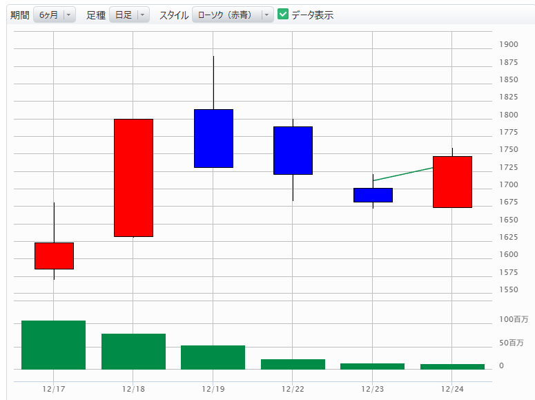 異常な過疎り具合 左側の12/17~19の下落時にはあんなに背が高かった緑の棒(出来高)が、今日(一番右)は虫眼鏡で見ないと見えないレベルまで減っています。