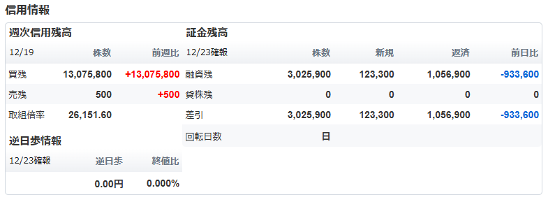 信用買残:13,075,800株(前週比 +13,075,800株) これ、見間違いじゃありません。「借金をして株を買っている人」が、なんと一週間で1300万株も急増しています。