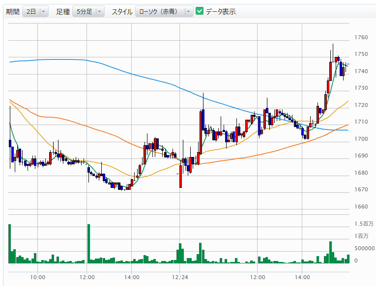 5分足チャートを見ると、引けにかけて急上昇していますが、これも【理由1】と同じで、参加者が少なすぎて値動きが軽くなっているだけです。