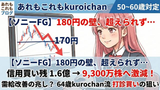 株式投資 「ソニーFG(8729)運命の分かれ道!180円の壁 vs 175円の防衛線。今、僕が『手出し無用』と判断した理由」 2026年1月9日 kurochan みなさん、こんにちは。「あれもしたいこれもしたい」ブログのkurochanです。 「更新継続のために応援クリックをお願いします」 …